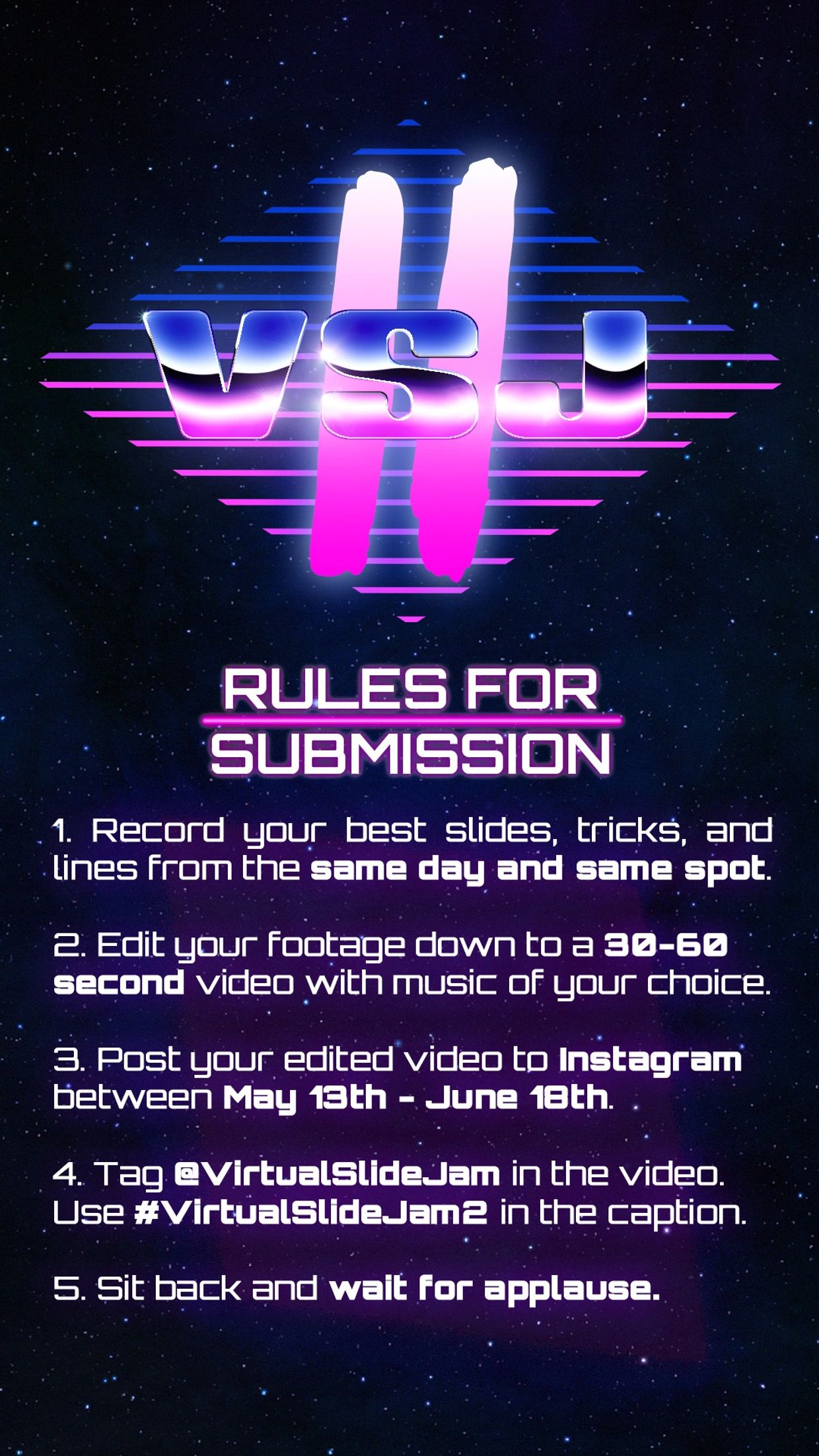 Film one days worth of skating on one hill in the timeline of May13th- June 18th. (Submissions will not be counted if filmed outside this window). Make an edit, 30- 60 seconds in length with your choice of music and submit it to Instagram before June 19th. Tagging us @virtualslidejam and typing #virtualslidejam2 in the caption.